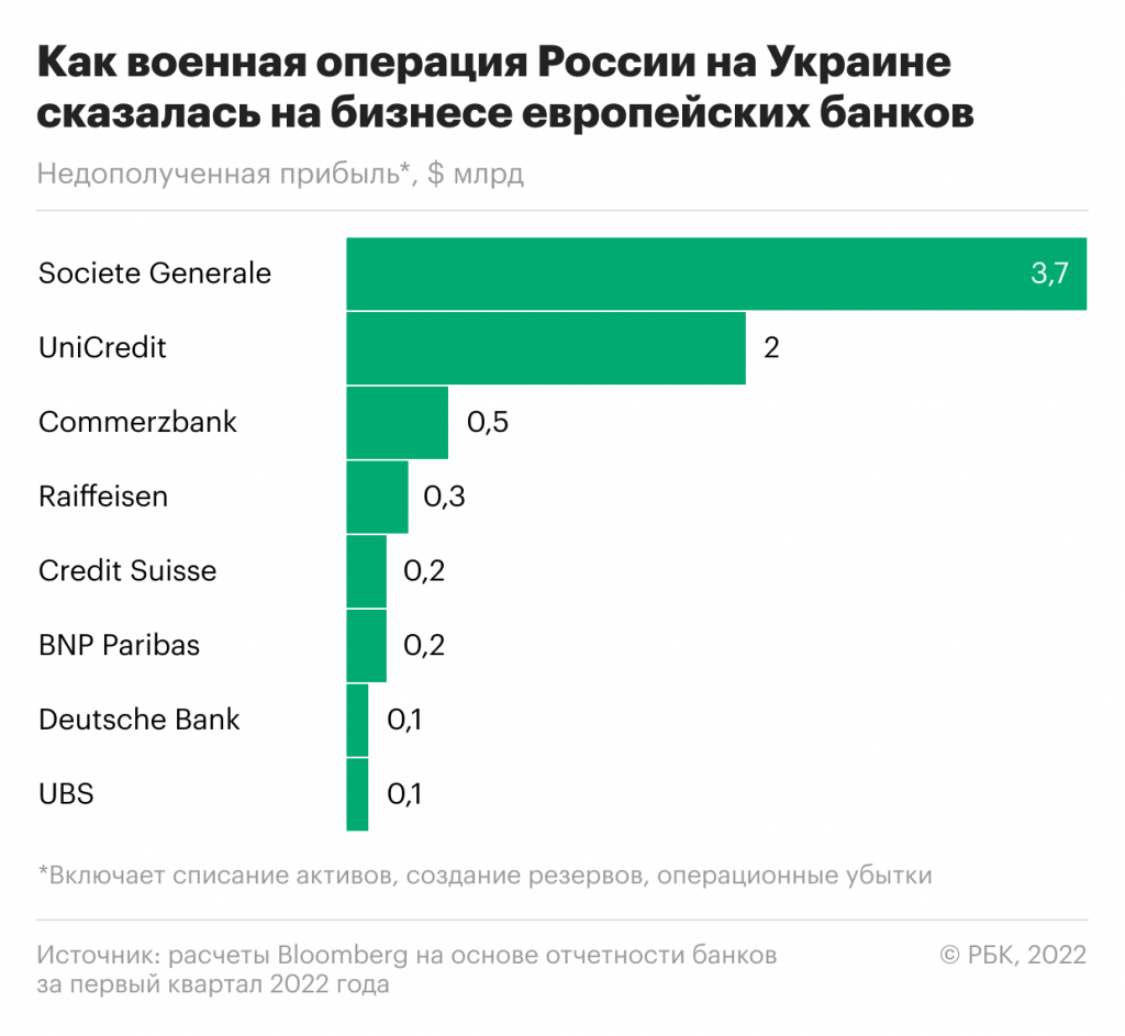 Потери Societe Generale, связанные с Россией, составили $3,7 млрд, UniCredit — $2 млрд, Commerzbank — $500 млн, Raiffeisen — $300 млн, Credit Suisse — $200 млн, сообщает издание со ссылкой на информацию компаний и собственные подсчеты.