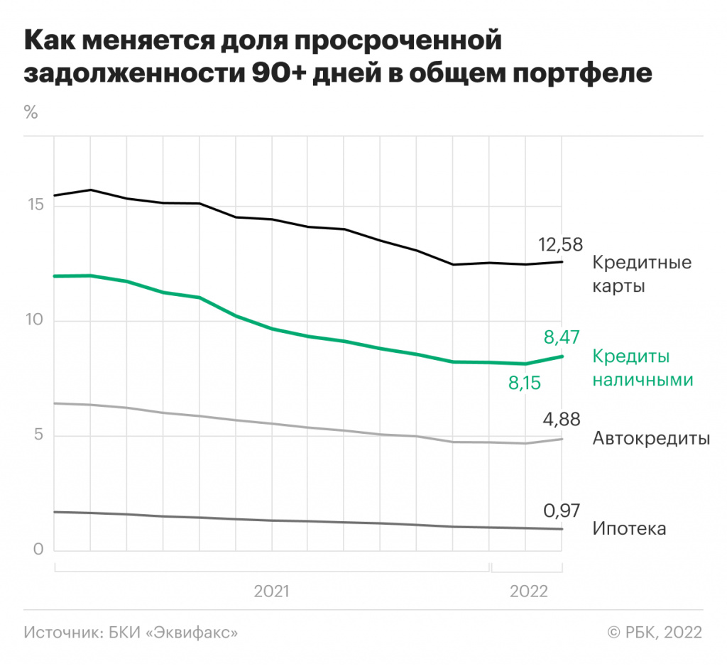 «На протяжении прошлого года мы прогнозировали рост уровня и объема просроченной задолженности в 2022 году в первую очередь в сегменте потребительских кредитов, еще задолго до реализации внешних ограничений в феврале—марте 2022 года. Эта тенденция была неизбежна с учетом наблюдавшегося в 2020–2021 годах перегрева рынка потребительского кредитования», — объясняет аналитик.