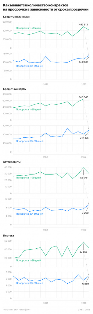 В феврале количество кредитов, по которым был допущен первый пропуск платежа, в среднем выросло на 30% по сравнению с январем, а в марте наблюдался всплеск просрочки на 22% уже на более длительном сроке (30–59 дней), следует из расчетов РБК на основе данных бюро кредитных историй «Эквифакс». Это означает, что проблемные долги, появившиеся в начале нынешнего кризиса, начинают вызревать, поясняет гендиректор БКИ Олег Лагуткин.