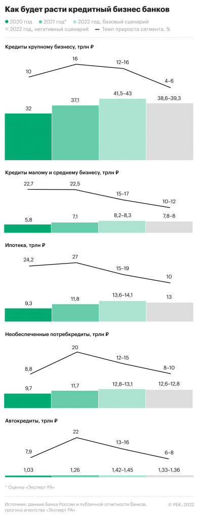 Как следует из прогнозов «Эксперт РА», ни один из сегментов кредитования в 2022 году не покажет более высоких темпов роста, чем в 2021-м. Самое существенное замедление (на 8–12 п.п.) произойдет в ипотеке — по расчетам аналитиков, ипотечный портфель банков увеличится в этом году на 15–19%, а если исключить влияние льготных госпрограмм и сделки секьюритизации, то лишь на 10–14%. Хотя ставки по ипотеке превысят «психологический уровень 10%», она останется драйвером рынка кредитования в этом году, полагают в агентстве.