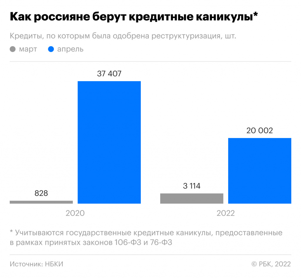 В целом количество предоставленных банками кредитных каникул пока не превышает показатели предыдущего кризиса. В апреле кредиторы одобрили отсрочку по 20 тыс. ссуд против 37,4 тыс. за аналогичный период 2020 года, оценили в НБКИ.