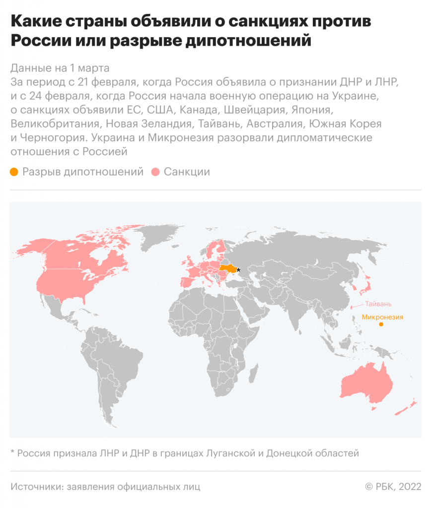 Евросоюз решил запретить любые транзакции своим резидентам с Банком России, заморозив часть его активов. Позднее о таком же решении объявили США (хотя ЦБ и не вошел в блокирующий список SDN). Также c 12 марта ЕC отключит банки ВТБ, «Россия», «Открытие», Новикомбанк, Промсвязьбанк, Совкомбанк и ВЭБ.РФ от системы SWIFT. К решению отключить российские банки от системы позже присоединились также Япония и Южная Корея.