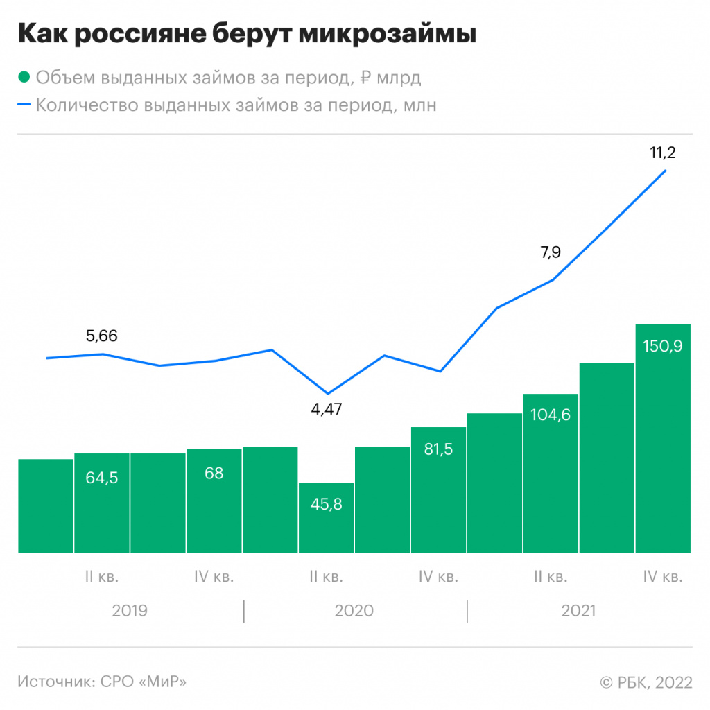 В четвертом квартале 2021 года россияне взяли 11,2 млн микрозаймов на рекордные 150,9 млрд руб., следует из статистики крупнейшей на рынке саморегулируемой организации «МиР» (РБК ознакомился с данными). В годовом выражении количество займов, полученных гражданами в октябре-декабре, подскочило на 117,9% — это самый резкий прирост с 2019 года (самые ранние доступные данные). Объем новых ссуд увеличился на 85,1% год к году, что тоже можно считать максимумом за два года (всплеск во втором квартале на 128,5% во многом был обеспечен низкой базой апреля-июня пандемийного 2020-го).