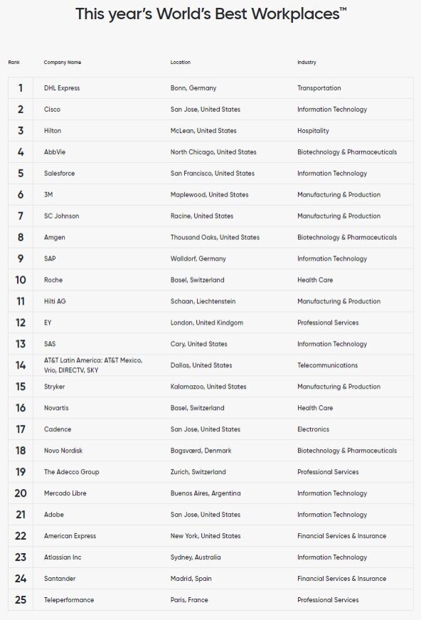 Список был составлен "Great Place to Work", специализирующейся на анализе корпоративного климата, после 7 500 опросов, проведенных среди 20 миллионов сотрудников. Этот международный список составляется уже 11 лет.
