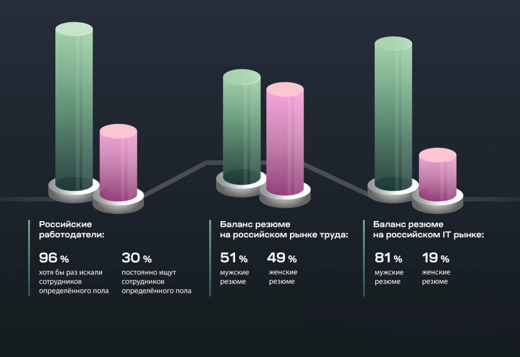 Хоть российские законы и запрещают дискриминировать соискателей и сотрудников по любым признакам, однако механизма, который бы реально мешал делать это на внутреннем уровне, пока не существует. По исследованию hh.ru за 2020 год, 96% российских работодателей искали сотрудников определённого пола. 30% работодателей постоянно ищут только мужчин или только женщин на некоторые позиции. Если в общем по рынку дисбаланс не так заметен — 51% мужских резюме против 49% женских — то в сфере информационных технологий Россия выглядит неравнозначной. Из всех резюме только 19% принадлежат девушкам. Среди пользователей сервиса по подбору вакансий в IT 21% женщин.