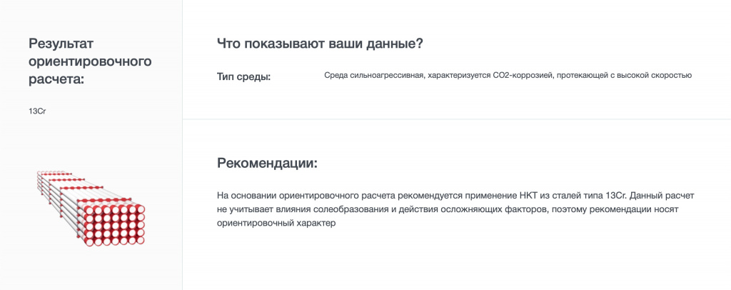 После подсчета система покажет рекомендации, написанные простым языком: какая марка стали нужна для трубы, какие условия в самой скважине. Также калькулятор покажет точность расчетов, предупредит, какие параметры не учел, и предложит ввести дополнительные данные, чтобы получить более конкретные рекомендации.