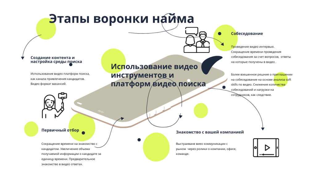 До 70% времени времени занимают этапы поиска и оценки кандидата. Видео инструменты могут использоваться HR специалистом на этапах, изображенных на рисунках. Все инструменты и платформы бесплатные и перечислены выше.