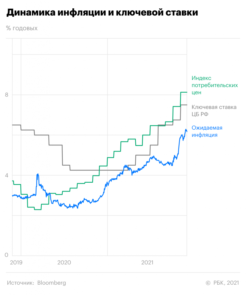Уровень инфляции — основной сигнал для принятия решений центральными банками, ключевая цель политики которых заключается в обеспечении ценовой стабильности. Разгон и превышение инфляции в два раза над целевым уровнем 4% сигнализирует о сохранении жесткой кредитно-денежной политики до тех пор, пока инфляция не вернется к 4%. По заявлению главы Банка России Эльвиры Набиуллиной, Центробанк намерен привести показатель инфляции к 4% до конца 2022 года.