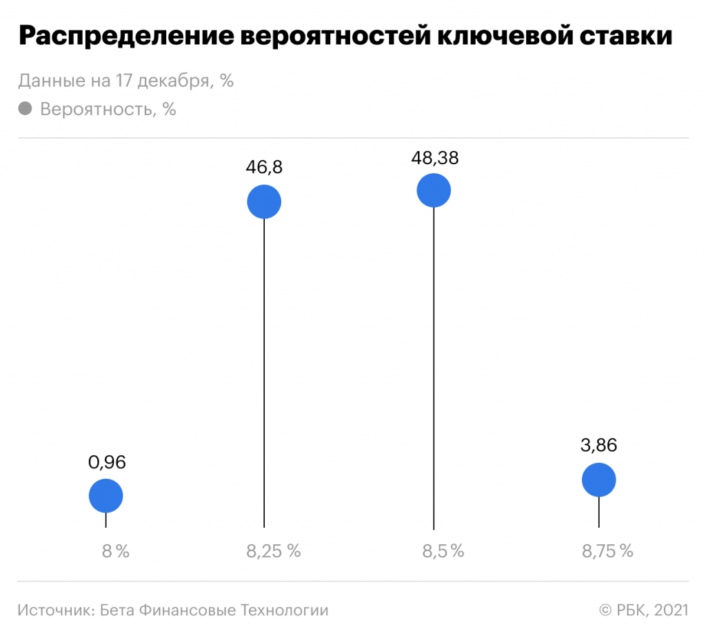 «Бета ФТ», исходя из своих внутренних моделей расчета вероятностей, ожидает следующие сценарии динамики ключевой ставки на ближайшем заседании Центрального банка на 17.12.2021: