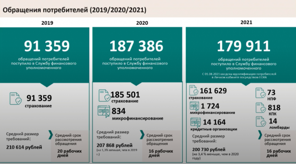Главный финансовый уполномоченный Юрий Воронин представил статистику работы с 2019 по 2021 год. Он рассказал, что основной объем дел, который рассматривает служба, связан со страхованием, среди них лидируют споры по ОСАГО. Спад обращений в 2021 году (по сравнению с 2020-м) Воронов объяснил началом работы претензионного порядка: прежде чем обращаться к финансовому уполномоченному, надо написать претензию к финансовой организации.
