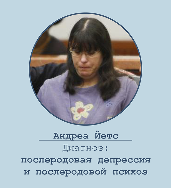 Похожая история приключилась с Андреа Кеннеди. Она родилась в 1964-м. В 25 лет американка познакомилась с Расселом Йетсом, а спустя 5 лет пара поженилась. Супруги решили, что хотят большую семью. В первый же год после свадьбы на свет появился первенец. После его рождения у матери началась послеродовая депрессия. Ей объяснили, что обычно это заболевание быстро диагностируется и вполне поддается лечению и прописали успокоительное. Тогда у пары появилось еще трое детей, а депрессивное состояние женщины усугубилось. Ей прописали антидепрессанты. Они не помогли: молодая мать пыталась покончить с собой. Врачам удалось ее спасти, и казалось, что ее состояние стабилизировалось. В 2000-м Кеннеди родила единственную дочь и произошел новый эпизод депрессии.