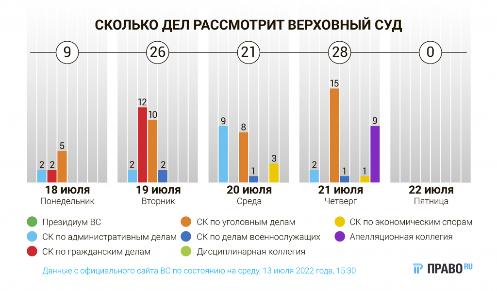 С 18 по 22 июля Верховный суд рассмотрит 14 гражданских дел: