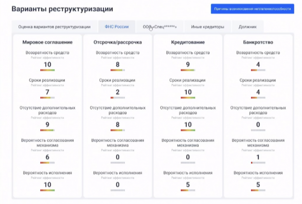 Система также анализирует доступные варианты взыскания долгов и взаимодействия с должником: она учитывает интересы всех мажоритарных кредиторов и оценивает выгоду от того или иного варианта для них. Программа показывает прогнозы и возможную прибыль для кредиторов при гипотетическом банкротстве. Чекмышев подчеркнул: доступ к такой информации должен быть у всех кредиторов, иначе не сработает.