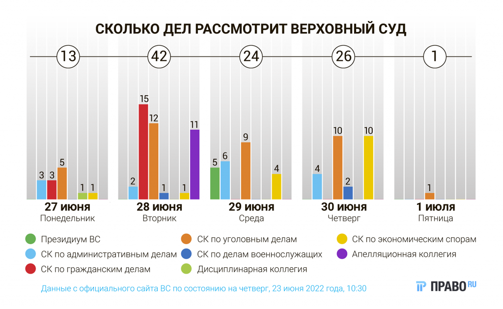 Апелляционная коллегия рассмотрит 11 дел, несколько из них буду судейскими. В деле № АПЛ22-216 бывший судья Юрий Захарчевский обжалует решение ВККС, которая разрешила привлечь его в качестве обвиняемого по ч. 4 ст. 264 УК («Нарушение правил дорожного движения и эксплуатации транспортных средств») за наезд на велосипедиста, который от травм умер. В отношении Захарчевского возбудили уголовное дело по ст. 125 УК («Оставление в опасности»), потому что он уехал с места происшествия.