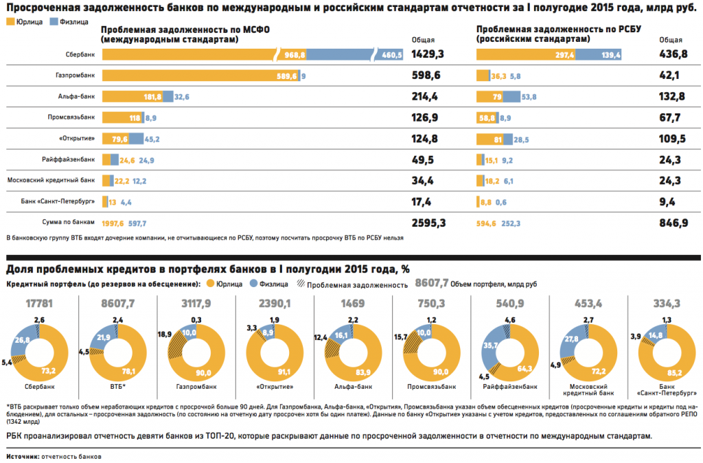 Доля просроченной задолженности по итогам первого полугодия 2015 года выросла с 4,2% до 5,9% в корпоративном портфеле, и с 5,9% до 7,5% в розничном кредитном портфеле. По МСФО у большинства банков доля выше.