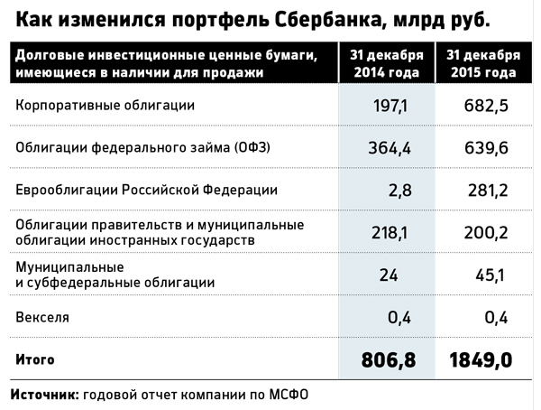 Суммарный объем портфеля ценных бумаг Сбербанка за 2015 год вырос почти на треть — с 2,2 трлн до 2,9 трлн руб., следует из банка отчетности по МСФО, опубликованной во вторник, 15 марта. Наиболее заметно росла доля корпоративных облигаций. Так, объем облигаций в портфеле бумаг, имеющихся для продажи, вырос с 806,8 млрд до 1,85 трлн руб., причем наиболее значительными темпами росла доля корпоративных облигаций и суверенных евробондов РФ. С начала года объем корпоративных облигаций в этом портфеле увеличился с 197 млрд до 682 млрд руб., евробондов — с 2,8 млрд до 281 млрд руб., ОФЗ — с 364 млрд до 639 млрд руб.
