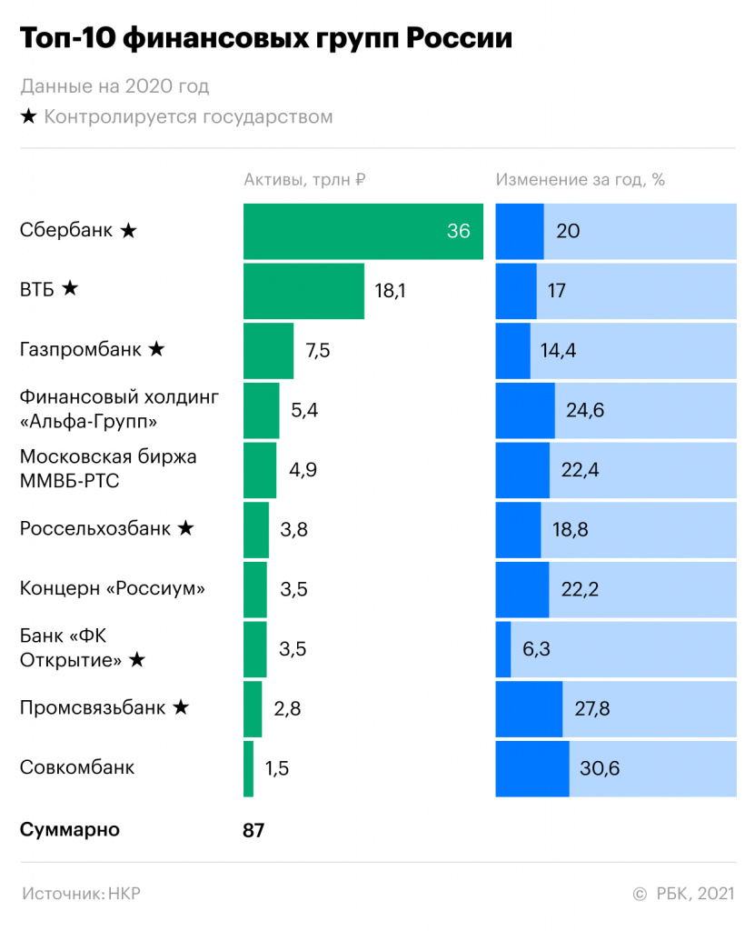 Первое место в рейтинге, как и годом ранее, занял Сбербанк, нарастивший активы на 20%, до 36 трлн руб. Другие участники лидирующей пятерки также не изменились: ВТБ остался на втором месте с активами 18,1 трлн руб., Газпромбанк — на третьем (7,5 трлн руб.), «Альфа-Групп» — на четвертом (5,3 трлн руб.), Московская биржа — на пятом (4,9 трлн руб.).
