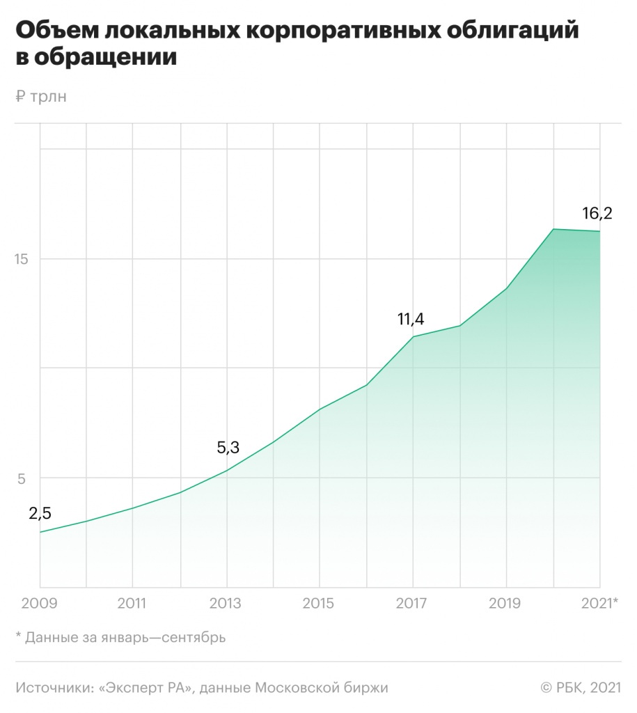 По итогам девяти месяцев 2021 года объем российского рынка локальных корпоративных облигаций составил 16,2 трлн руб. С начала года он сократился на 100 млрд руб., хотя до этого рос уверенными темпами — на 19,9% в кризисном 2020 году и на 14,3% в 2019-м, следует из данных Московской биржи. Сжатие рынка аналитики «Эксперт РА» связывают с ужесточением денежно-кредитной политики ЦБ: регулятор начал повышать ключевую ставку в марте и с тех пор поднял показатель на 3,25 процентного пункта, до 7,5%. Рост ключевой ставки сопровождался увеличением доходностей по долговым бумагам. В этих условиях крупные эмитенты взяли паузу в размещениях, а компании с рейтингом ruA- и ниже, наоборот, наращивают заимствования на облигационном рынке и дают инвесторам повышенную премию за риск, отмечают аналитики «Эксперт РА».