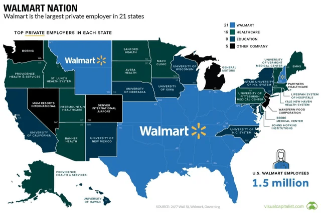 Если посмотреть на крупнейших частных работодателей в США по штатам, выявляется не столь тонкая тенденция: доминирует Walmart