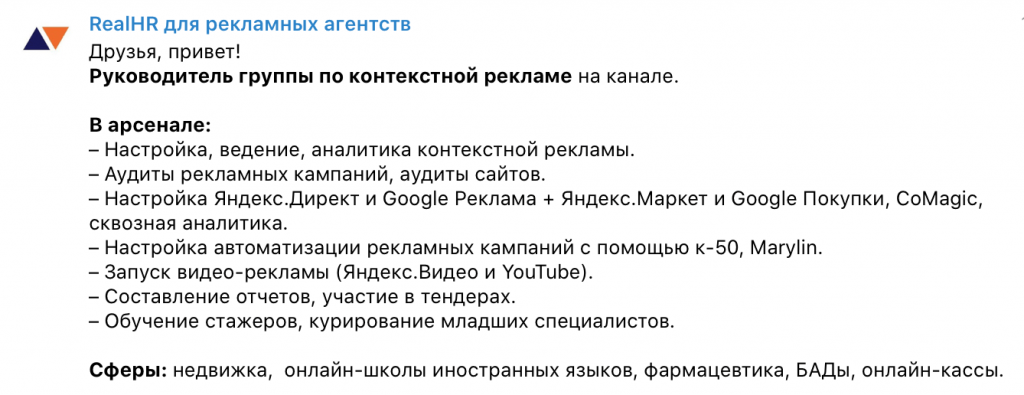 В названии места работы можно указать ключевые характеристики компании, в которой вы работали. Например, ТОП-3 несетевых performance-агентств, крупнейшее агентство мобильного маркетинга, онлайн-кинотеатр, ТОП-5 банк России и тд.