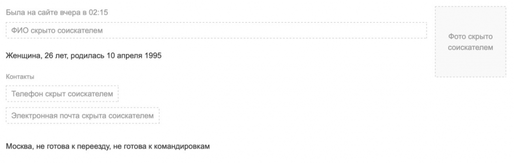 2. Как я писала выше, скрыв все свои данные, вы делаете ваше резюме недоступным и менее привлекательным, и многие рекрутеры крупных компаний, у который большая нагрузка по работе, просто пройдут мимо вашего резюме.