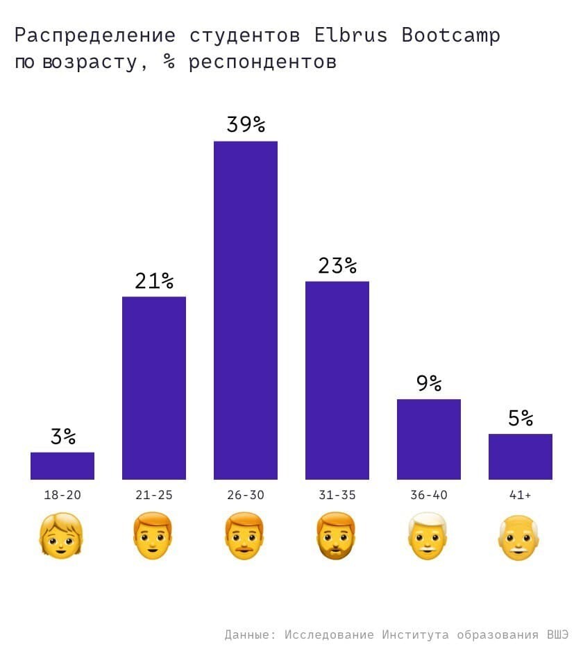 Самым популярным возрастом для смены профессии оказались 26-30 лет (39% выпускников). Люди в возрасте 31-35 составили 23%, и еще 14% — люди 36-40 и старше, в противоречие мифу о том, что определиться с профессией нужно до 30-ти.