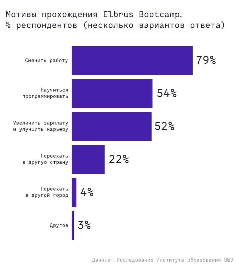 В качестве основного мотива для обучения выпускники называли желание сменить работу (79% опрошенных), научиться программировать (54%), увеличить зарплату и улучшить карьеру (52%), уехать в другую страну (22%).