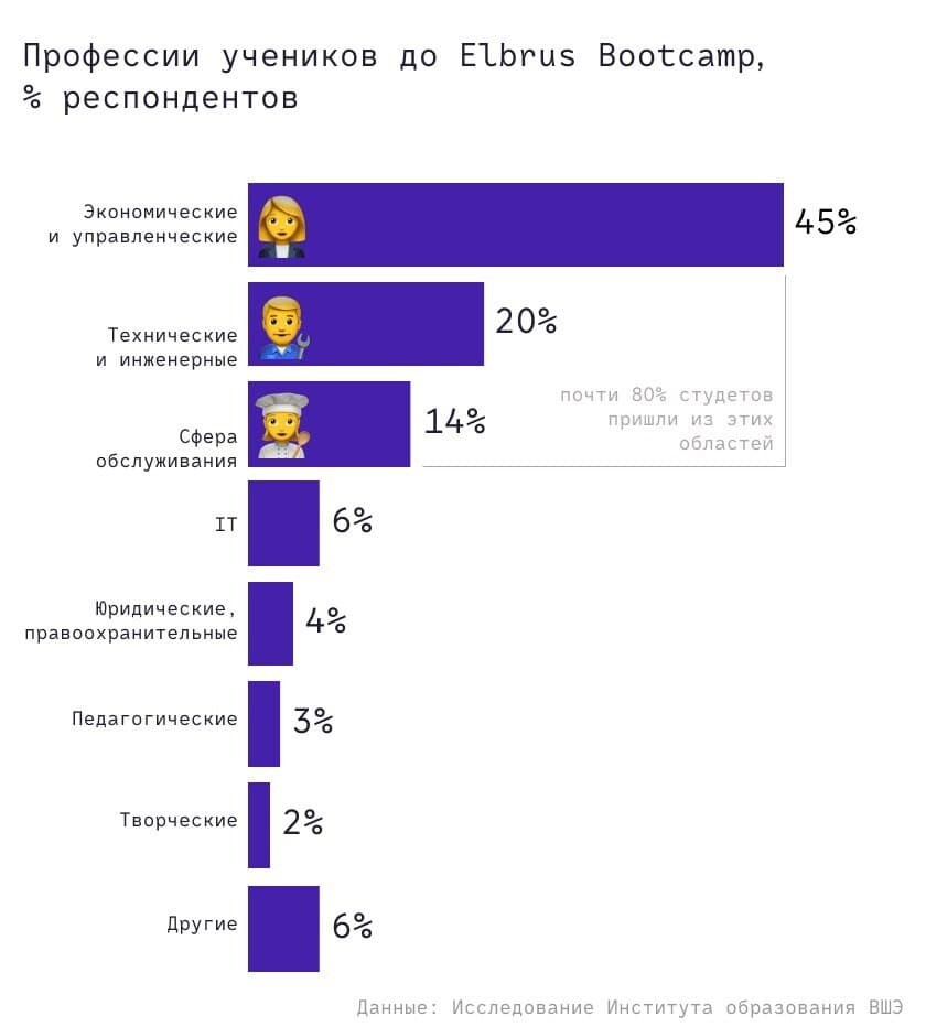 Отсутствие технического образования не становится преградой для реализации целей переподготовки. В буткемп приходят с экономических и управленческих должностей, из образовательной отрасли и сферы обслуживания. Технического образования не имели 80% выпускников.