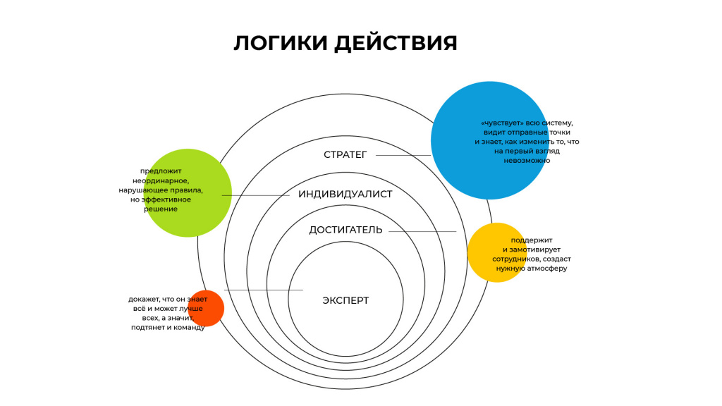 Краткое описание Логики действия Стратег: системно и комплексно видит мир; сканирует состояние всех элементов системы; нацелен и на процесс, и на результат; умеет управлять различиями и конфликтами; вдохновляет команду смыслами, а не только мотивирует; ориентируется на сотрудничество и синергию; объединяет и поддерживает сотрудников.