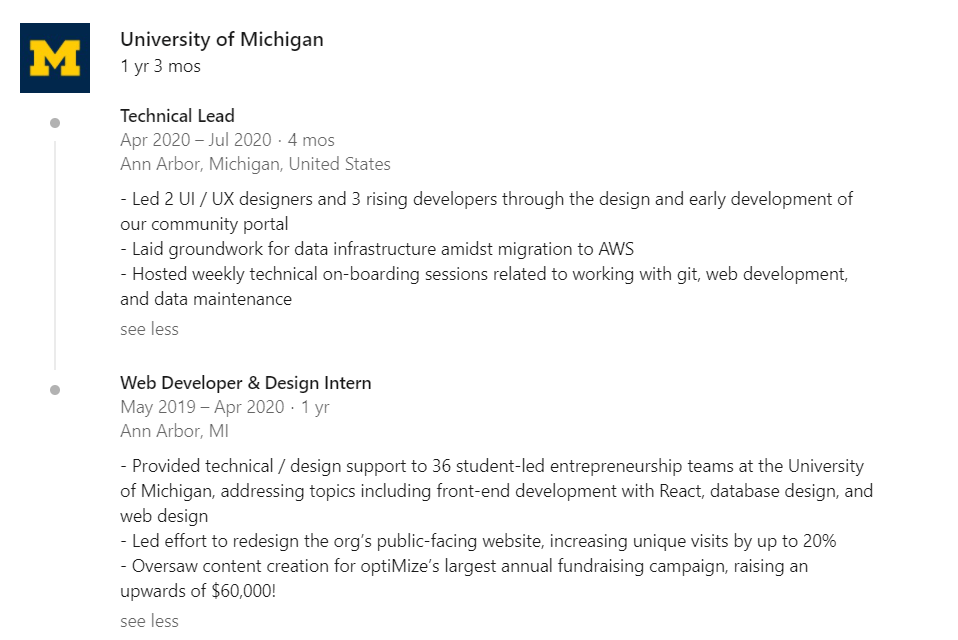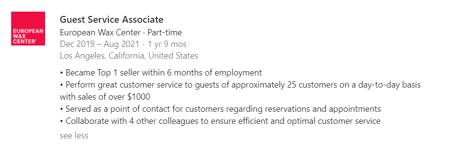 Этот раздел должен быть заполнен. Заполнен не поверхностно, а с указанием ключевых моментов, которых вы добились, пока работали в данной должности.