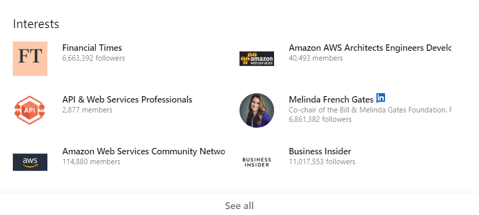 Обычно в данный раздел добавляют инфлюенсеров и пару известных компаний. Просто для понта. Так профиль выглядит стильно и показывает то, что у вас есть свои профессиональные интересы и вы что-то тут вообще читаете.