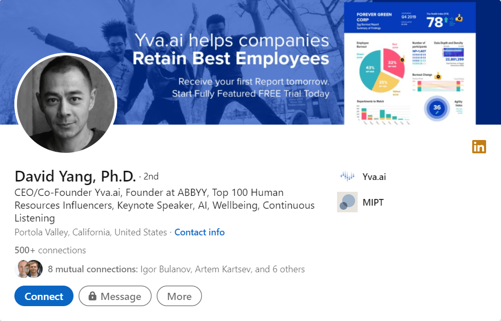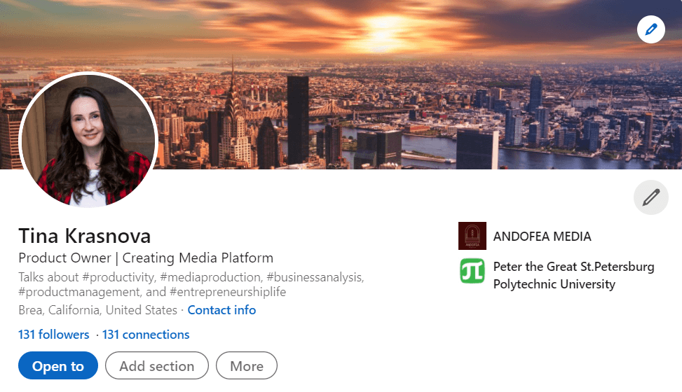 Еще помните, что Вы не машина, пишите просто и доброжелательно. В LinkedIn сейчас куча профилей, в которых рассказ о себе начинается со слов "я офигенно крутой специалист с черным поясом по всем технологиям на свете".