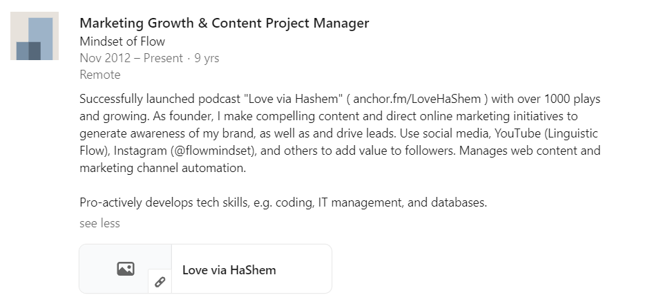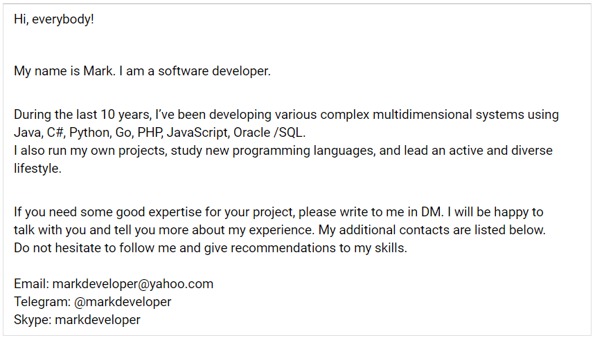 Вот пример из профиля моего бывшего коллеги, который не ищет работу, поэтому у себя в профиле выдает описание в стиле short summary.