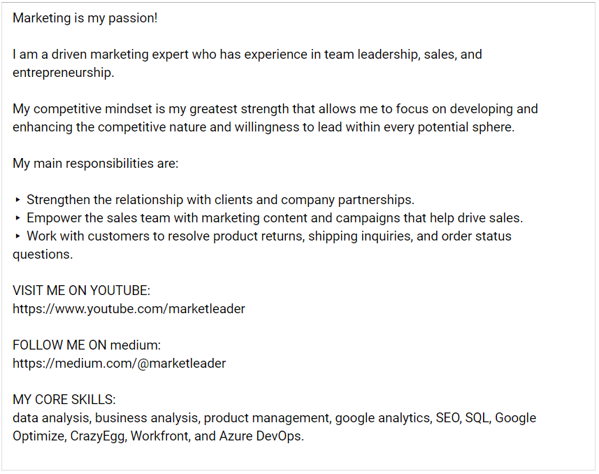 Пример №2. Человек желает рассказать о себе и сделать акцент на своем профессионализме.