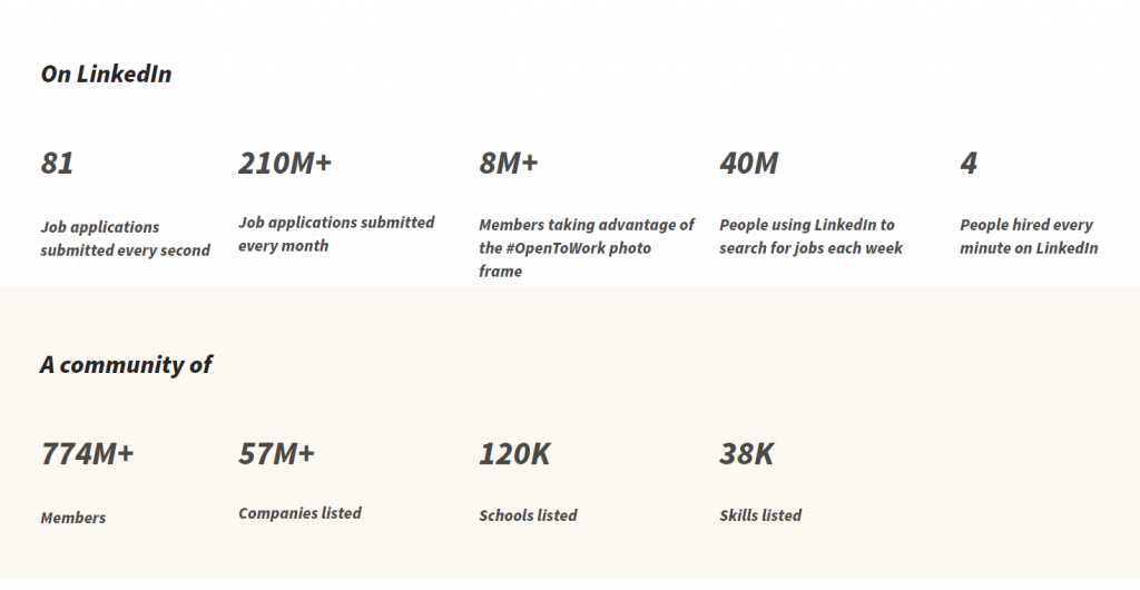 Каждый месяц LinkedIn посещают более 200 миллионов человек. На портале каждый месяц публикуется по 210 миллионов вакансий от 57 миллионов компаний, сообщества которых, открыты для каждого пользователя.