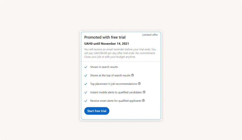 На старте у вас есть возможность попробовать бесплатное поднятие вашей вакансии в рамках тестового периода.