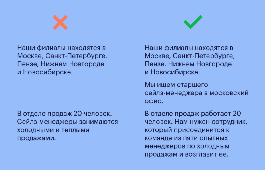 Из описания вакансии кандидат больше всего хочет точно понять, какими будут именно его задачи и условия работы. Цель хорошо описанной вакансии — избавить кандидата от страха неизвестности: новый сотрудник придет в незнакомую ему среду, поэтому нужно постараться в деталях описать все, что будет касаться его работы.