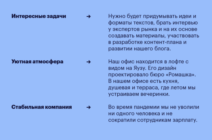 «Интересные задачи», «уютная атмосфера», «стабильная компания» скорее оттолкнут кандидатов. Подумайте, что за подобными фразами скрывается в вашей компании, и опишите это: