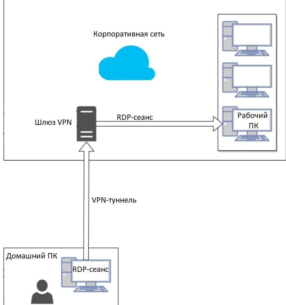 При таком способе сотрудник подключается с помощью домашнего ПК к так называемой корпоративной виртуальной частной сети (VPN), представляющую собой туннель с использованием шифрования данных, которыми обменивается домашний ПК с корпоративным периметром сети. После установления VPN-подключения, сотрудник подключается через службу удаленных рабочих столов (RDP) к своему рабочему ПК, через который получает доступ к привычному рабочему окружению.