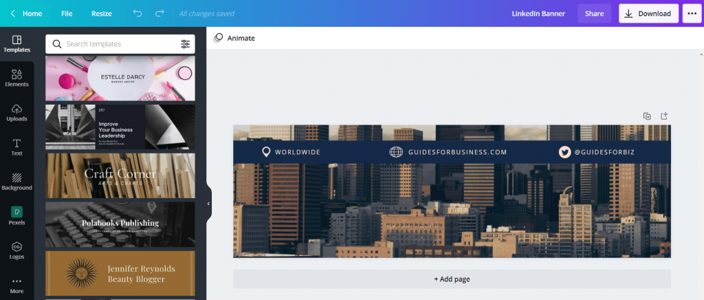 3. Использовать бесплатную среду Canva, имеющую специальный раздел для создания баннеров LinkedIn. Среда даёт возможность использовать готовый шаблон, поменять картинку, добавить надпись, объекты и прочее.