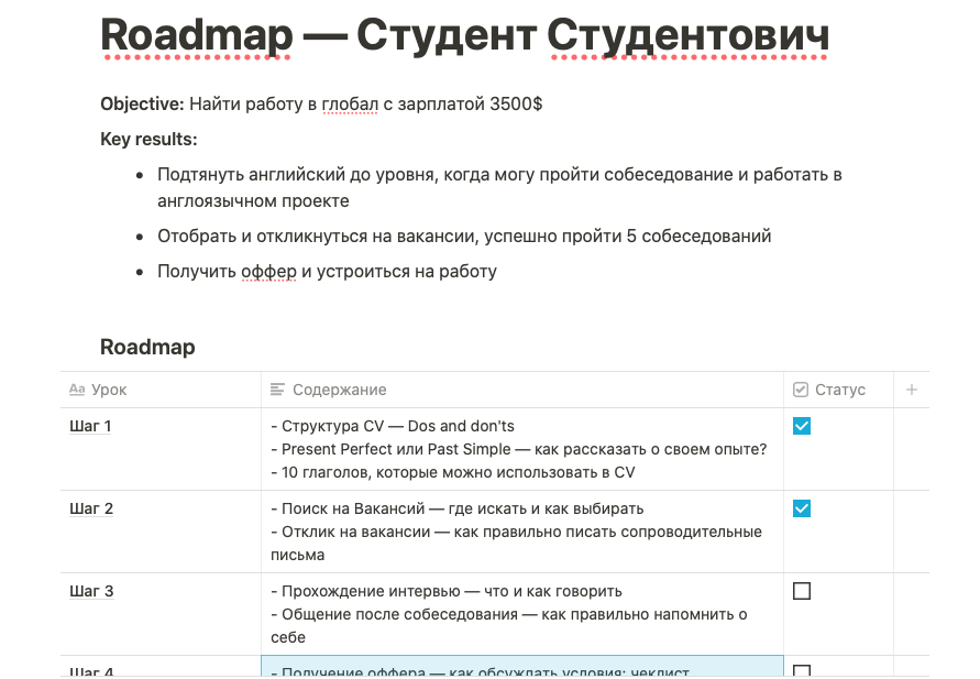 Сейчас мы проводим бесплатные консультации по трудоустройству в глобал. На zoom-созвоне за 40 минут мы определим вашу цель и распишем индивидуальный путь трудоустройства в компанию вашей мечты. Результат выглядит примерно так:
