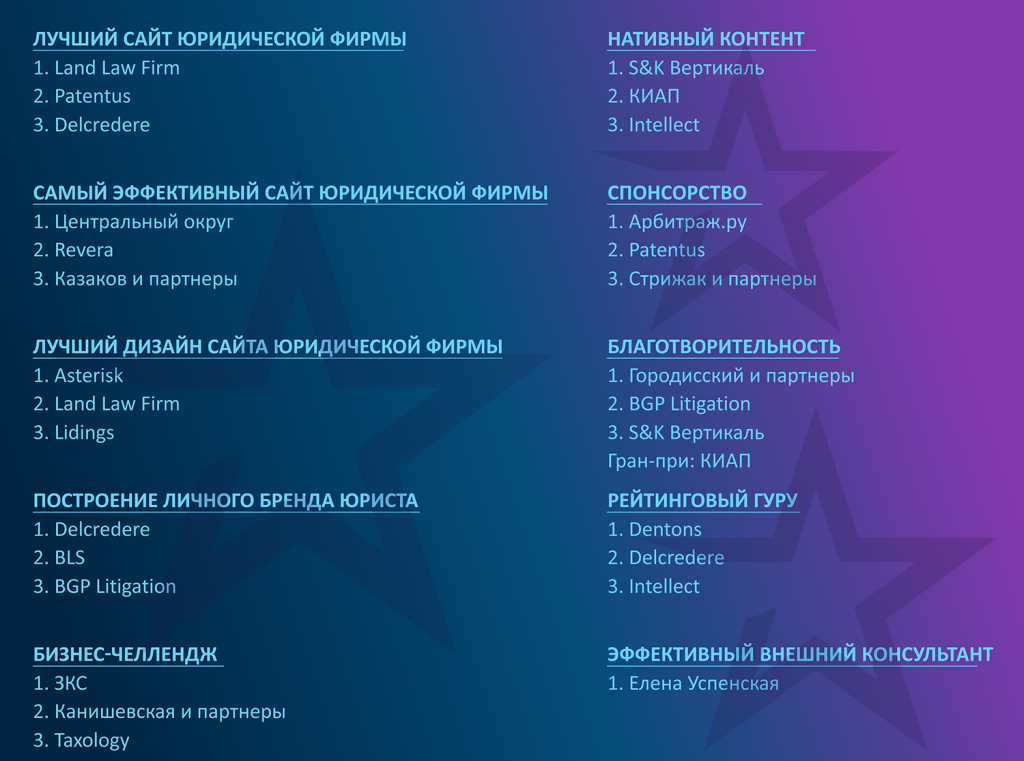 Полный список победителей премии Best Law Firm Marketing представлен ниже.