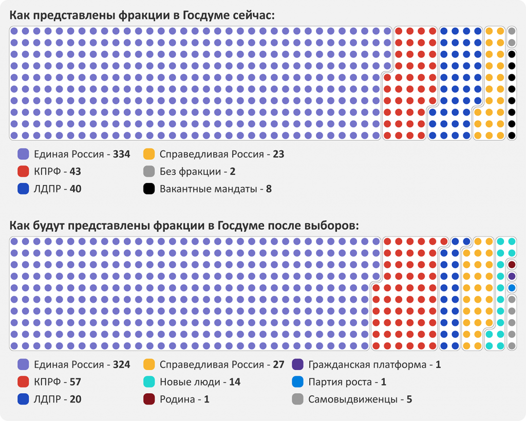 Еще 225 депутатских мест распределялись по одномандатным округам. Кандидаты «ЕР» взяли верх в 199 округах, у КПРФ — 9 округов, «Справедливая Россия — за правду» — в 8, по одному мандату взяли либерал-демократы, «Родина», «Гражданская платформа» и «Партия роста». Пять кресел займут самовыдвиженцы.