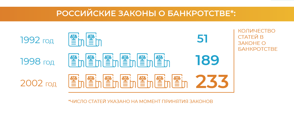 Процедуры банкротства растягивались на такое продолжительное время, что в 2002 году, когда приняли уже третий по счету закон о банкротстве, суды еще завершали рассмотрение банкротных дел, возбужденных по правилам законодательства 1992 года.