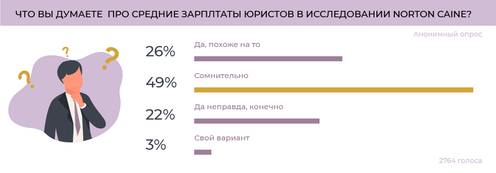 Но даже с учетом премий и бонусов полученные в результате опроса цифры существенно отличаются от представленных в обзоре Norton Caine. Это не означает, что зарплат из обзора вообще не существует, говорит Артюх. Они могут быть, но будут сильно выбиваться из общей рыночной картины, уверен юрист.