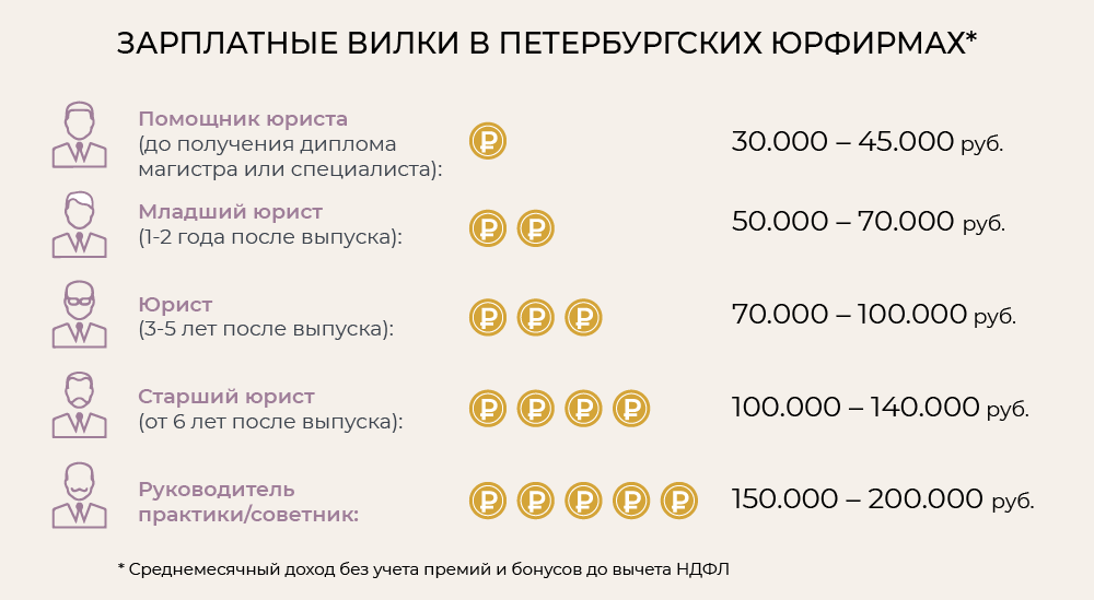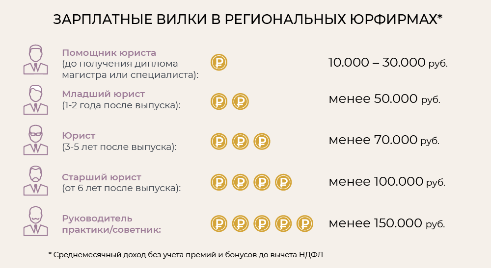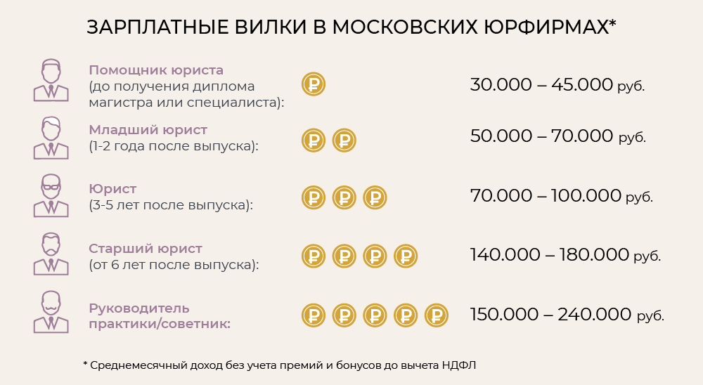 Также нужно учитывать, что в инфографике приводятся только самые распространенные размеры окладов. Общий доход юристов может быть больше за счет премий и бонусов. Например, обычный месячный доход юриста в Москве – 100 000 – 130 000 руб., старшего юриста – 180 000 – 220 000 руб., а руководитель практик с учетом стимулирующей части может рассчитывать на 380 000 руб. и более.
