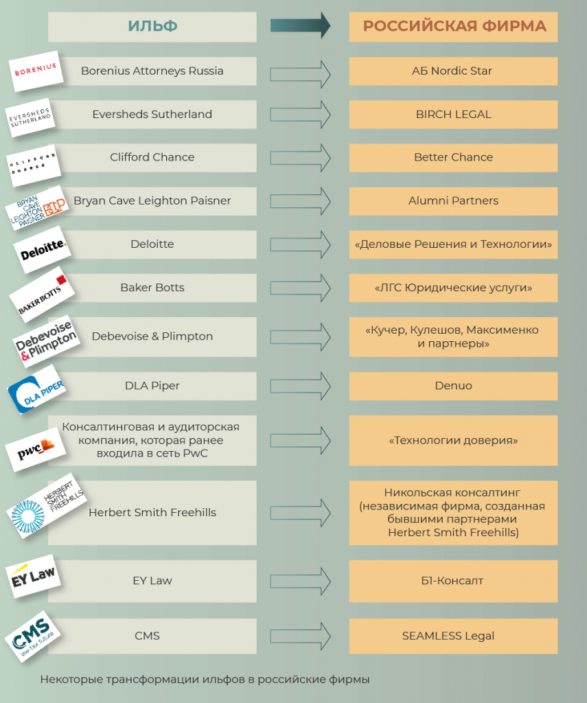 По наблюдениям Панченкова, , все иностранные клиенты, которые сотрудничали с командой его компании в формате международного офиса, перешли в российскую фирму. Во-первых, клиенты продолжают работать с конкретными юристами и партнерами, которые годами их не подводили в плане сервиса и качества. У них существуют логичные ожидания, что не подведут и теперь. Во-вторых, в качестве альтернативы там сейчас будут такие же российские фирмы, которые создают юристы из других ильфов, или, опять же, присутствовавшие на рынке до последних событий российские фирмы. Клиент разумно делает выбор в пользу понятной парадигмы взаимоотношений с понятными ему людьми.