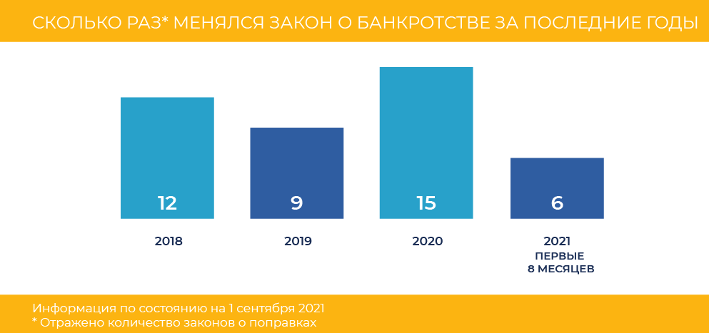 За 19 лет существования закона о банкротстве в среднем каждый год в него вносят изменения минимум шестью законами. В последнее время скорость гораздо выше. До конца 2021-го еще несколько месяцев, а банкротные нормы поменяли уже шесть раз.