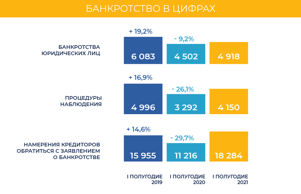 А вот Голубев уверен, что эффективность нормы можно оценить уже сейчас. Мораторий позволил избежать лавины банкротств в кризисном 2020 году, уверен юрист. После окончания моратория резкого скачка банкротств не произошло, добавляет Стихина. В первом полугодии 2021 года количество банкротств было на 19% меньше, чем в том же периоде 2019-го. Но радоваться рано. Международная страховая группа Coface предсказала волну отложенных банкротств осенью этого года.