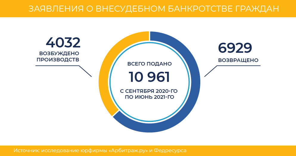 Вводили «упрощенное» банкротство для того, чтобы снизить нагрузку на суды и повысить «доступность и эффективность банкротства для граждан». Именно эти цели депутаты указали в пояснительной записке. Но надежды государства на новый институт пока не оправдались, говорит Денис Голубев, советник судебно-арбитражной практики . К концу июня 2021-го граждане подали около 11 000 заявлений. Больше 60% из них возвращены.
